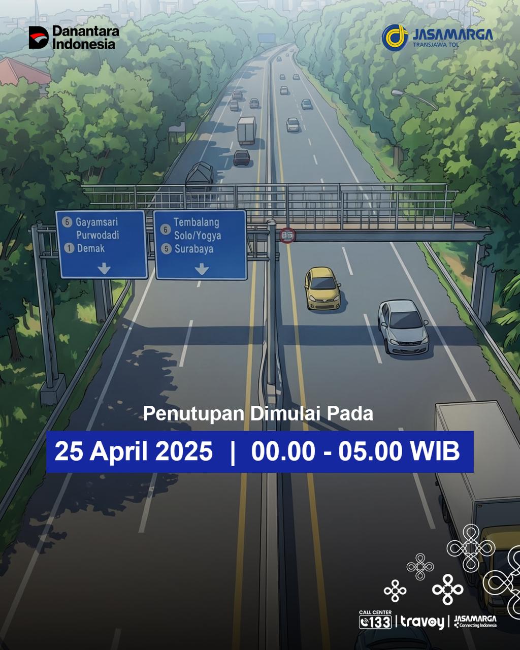 Saat ini JTT tengah menyiapkan langkah penanganan lanjutan bersama pihak terkait dan tenaga ahli, termasuk rencana pekerjaan perbaikan pada struktur JPO yang terdampak. Dalam rangka mendukung kelancaran pekerjaan tersebut, akan dilakukan pengaturan lalu lintas pada Sabtu, 25 April 2026 pukul 00.00 WIB s.d 05.00 WIB sebagai berikut: