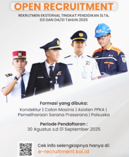 Pendaftaran dibuka mulai 30 Agustus hingga 1 September 2025 melalui laman resmi https://e-recruitment.kai.id. Seluruh proses seleksi dilaksanakan di masing-masing Daerah Operasi/Divisi Regional dengan pengawasan ketat untuk menjamin transparansi dan integritas.