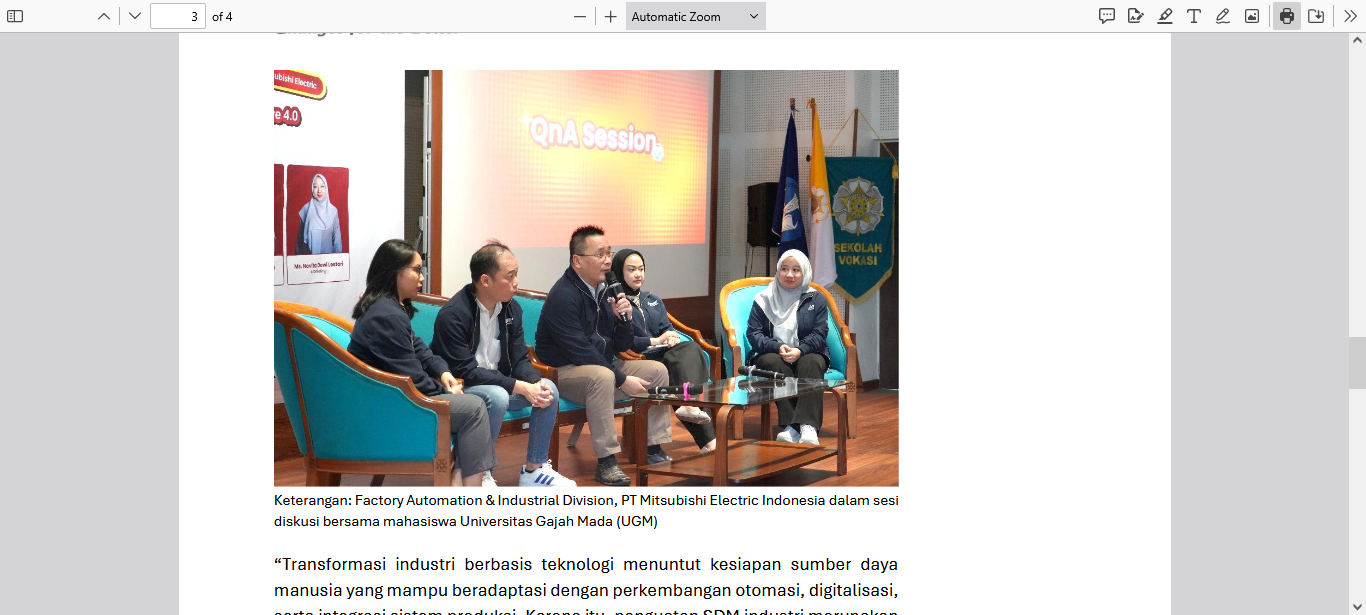 Komitmen ini diwujudkan melalui kegiatan kuliah umum mengenai teknologi Smart Factory dan Industry 4.0 yang diselenggarakan bersama Universitas Gadjah Mada (UGM) di Teaching Industry Learning Center (TILC) Sekolah Vokasi UGM yang dihadiri oleh mahasiswa/i Sekolah Vokasi dan Fakultas Teknik.