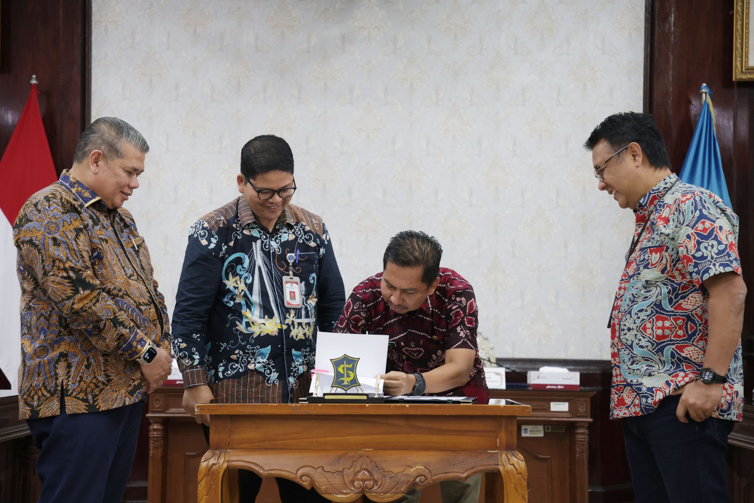 Pemerintah Kota (Pemkot) Surabaya menerima kunjungan kerja jajaran perangkat daerah (PD) Pemkot Batam di ruang sidang wali kota, Balai Kota Surabaya, Kamis (26/2/2026). Dalam kunjungan tersebut, jajaran Pemkot Surabaya dan Pemkot Batam melakukan penandatanganan perjanjian kerjasama mulai dari inovasi bidang digitalisasi hingga kesehatan.