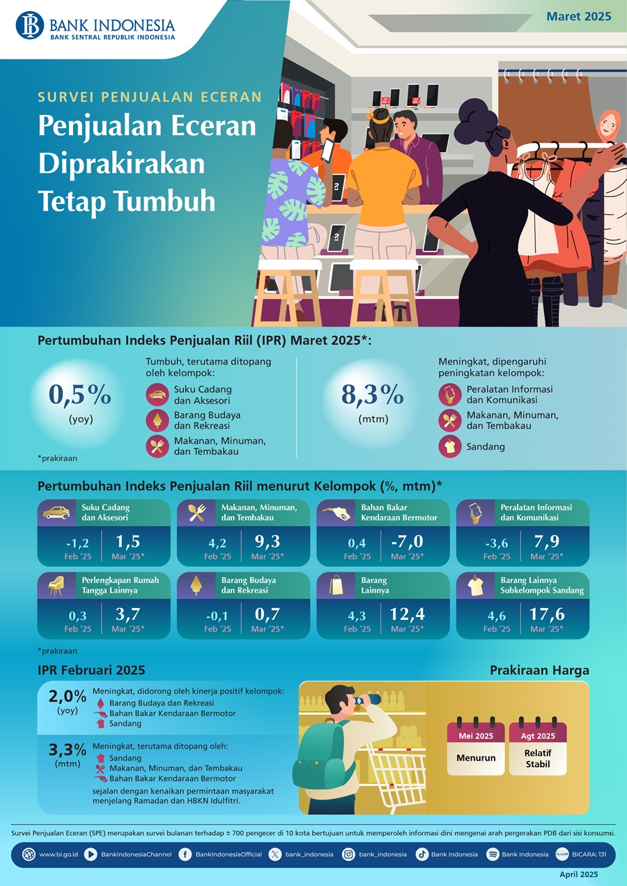 Kinerja penjualan eceran tersebut terutama ditopang oleh pertumbuhan Kelompok Suku Cadang dan Aksesori, Barang Budaya dan Rekreasi, serta Makanan, Minuman dan Tembakau. Secara bulanan, penjualan eceran pada Maret 2025 diprakirakan tumbuh 8,3% (mtm), lebih tinggi dibandingkan dengan pertumbuhan pada bulan sebelumnya.
