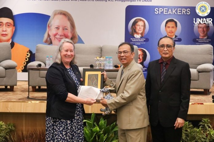 Acara ini dihadiri Rektor Unair Prof. Dr. Muhammad Madyan SE MSi MFin, Ketua Mahkamah Agung RI Prof. Dr. Sunarto SH MH, serta Chief Justice of Federal Court of Australia, Debra Mortimer.